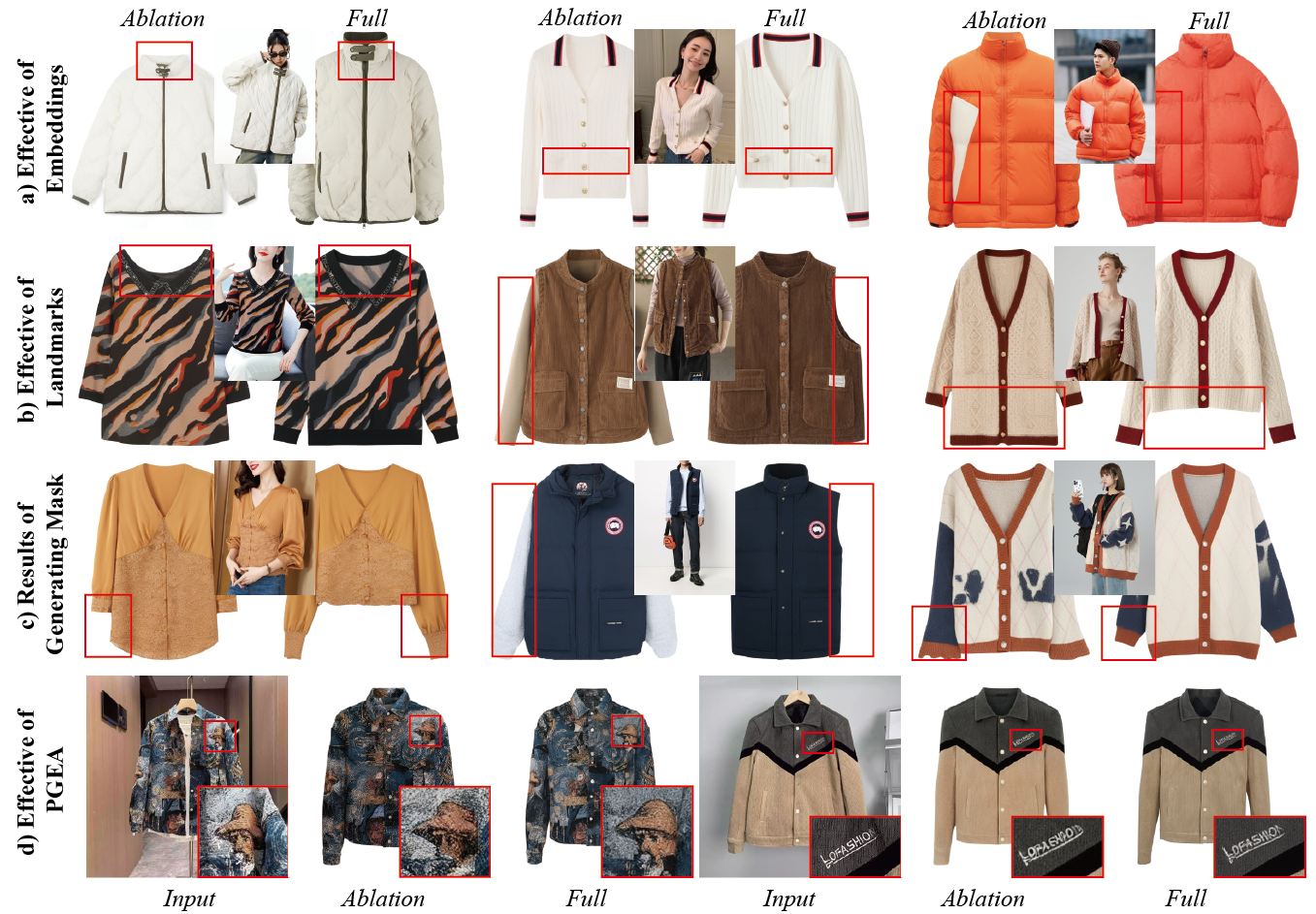 Without landmarks, RAGDiffusion suffers inaccurate shape. Embeddings from StructureNet improve inner structure, while PGEA enhances detail preservation.