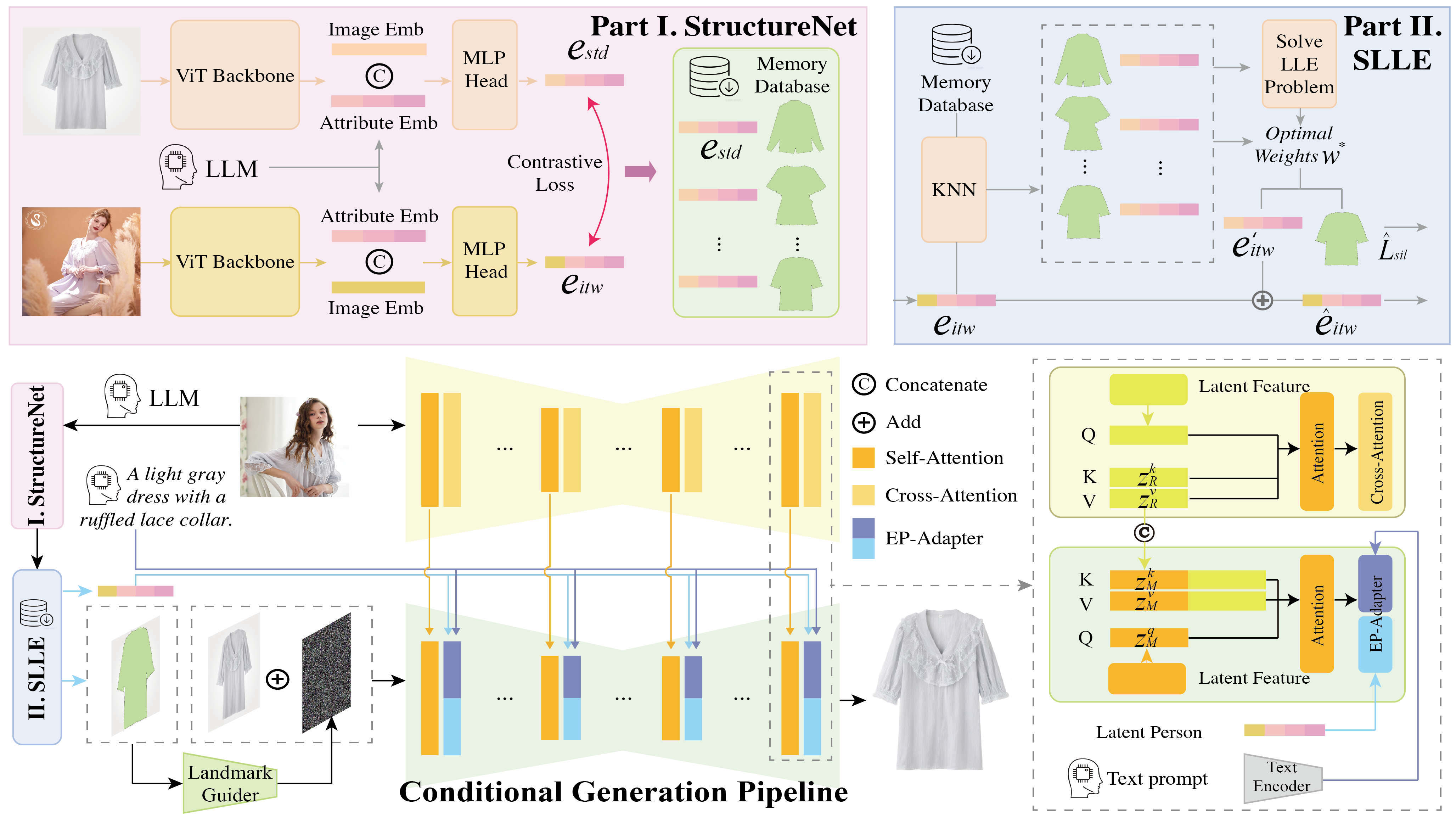 Retrievalbased Structure Aggregation: Contrastive learning is firstly introduced to train a dual tower network to extract multi-modal structure embeddings from images of two branches as well as attributes derived from a frozen LLM. Structure Locally Linear Embedding (SLLE) to project the predicted structure embedding towards a standard manifold as well as offer a silhouette landmark.