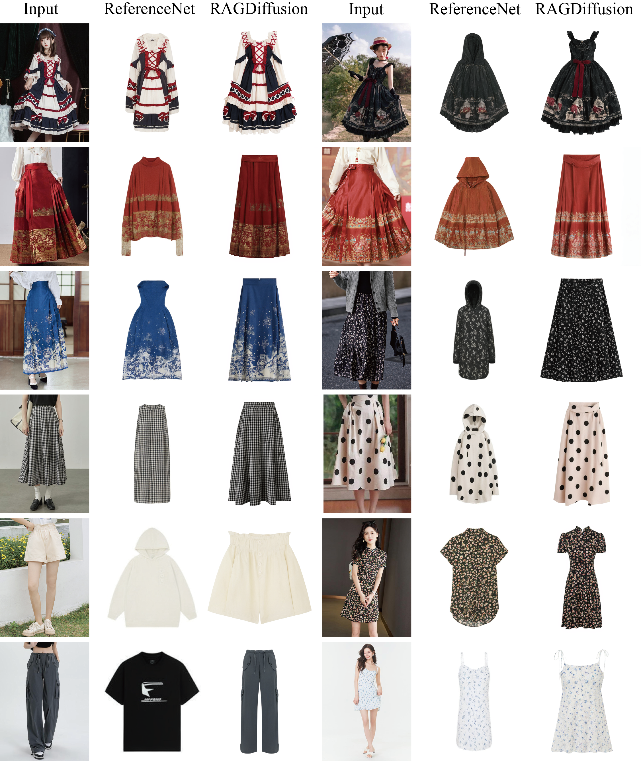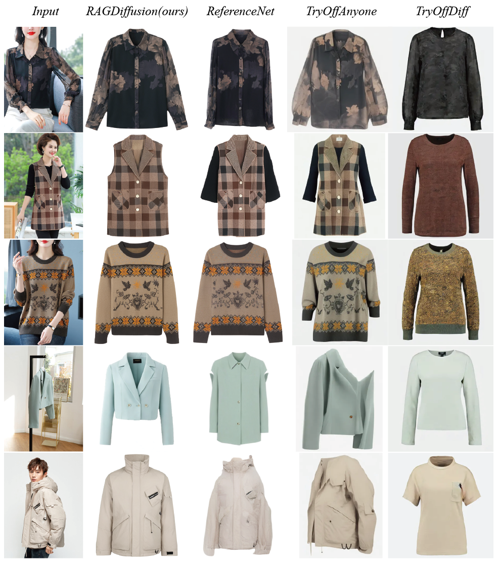 Faithfulness: RAGDiffusion achieves omni-level faithful preservation of garments at the structural, pattern, and decoding levels, preserving fine details without loss and reaching an e-commerce-ready quality.