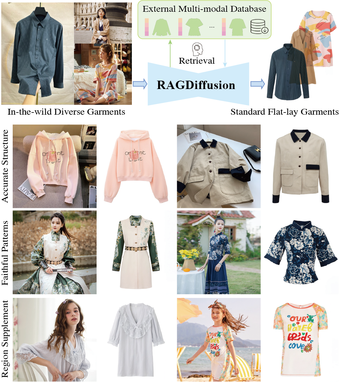 To address this issue, we propose a novel Retrieval-Augmented Generation (RAG) framework, termed RAGDiffusion, to enhance structure determinacy and mitigate hallucinations by assimilating knowledge from language models and external databases. RAGDiffusion consists of two processes: (1) Retrieval-based structure aggregation, which employs contrastive learning and a Structure Locally Linear Embedding (SLLE) to derive global structure and spatial landmarks, providing both soft and hard guidance to counteract structural ambiguities; and (2) Omni-level faithful garment generation, which introduces a coarse-to-fine texture alignment that ensures fidelity in pattern and detail components within the diffusing. Extensive experiments on challenging realworld datasets demonstrate that